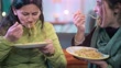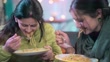 In this indoor video, two Asian/Indian happy women enjoy steaming hot Chinese veg noodles in winter at night by sitting on a couch in the living room. They are in the warm dress.