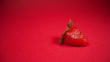 Ultra Close-Up Macro Moving Track Shot von einem frischen Reifen köstliche In-Season bright Red Strawberry Sitzen auf einem roten Hintergrund