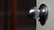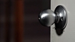 View of Black Widow Spider crawling under doorknob as it hangs from a web.
