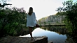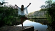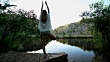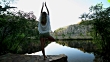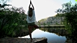 Young woman by the lake exercises yoga in a Tree pose. Beautiful Summer day.