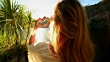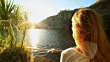 Junge Frau am See macht Herzform Fingerfeld - HD Stock-Video