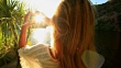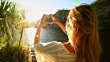 Young woman by the lake makes a heart shape finger frame. Beautiful Summer day.